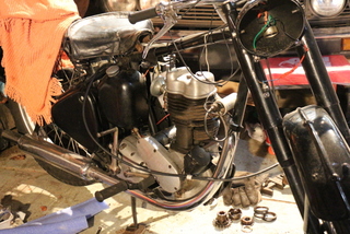 Dernièrement il m'avait proposé de bricoler un peu sur la boîte de vitesse, et on s'y est mis aujourd'hui . La boîte actuellement sur la moto a un problème de passage de la première, mais il en a deux autres, et nous allons essayer d'en faire une correcte avec deux en état ... inconnu. Elles ont déjà été démontées, il va donc parfois faire preuve d'imagination pour le remontage, mais Martin (optimiste) compte sur mon expérience avec la saga des boîtes de 5HP Citroën de mon ami André ... Nous nous occuperons ensuite de la boîte de la moto.