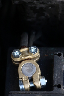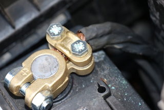 . Je découpe soigneusement (toujours sur les conseils de Caloumthai) la cosse en plomb, car il n'y a pas beaucoup de "mou" sur ces câblages, et il faut que la nouvelle cosse atteigne la batterie .