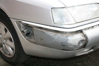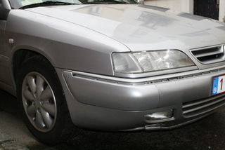 Un voisin arrive et me dit calmement : "Bonsoir Monsieur, "on" a arraché l'avant de votre voiture dans le parking !" ... Je cours, pensant déjà que je n'ai plus qu'une demi Xantia et qu'il va me falloir retrouver un moteur, une boîte, tout le train avant et la carrosserie qui va avec ! Heureusement, il ne s'agissait que de la coquille avant droite du pare-choc, ainsi que du jonc en plastique chromé, j'ai eu chaud ! Le maladroit est bien entendu parti sans demander son reste, j'espère qu'il s'est pris mon pare-choc dans sa portière et qu'il a plus de dégâts que moi.