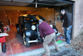 Nous rentrons la voiture, essayons de régler le câble d'embrayage qui n'a (en plus) pas de garde, mais rien à faire, les vitesses ne passent toujours pas, nous allons devoir déposer toute le groupe. Le garage loué par Pierre ne se prête pas à de gros travaux de mécanique, et il faudra trouver un local pour faire cela dans de bonnes conditions. La dépose des tambours attendra, d'ailleurs il fait tellement froid que je n'arrive même plus à réfléchir !