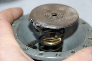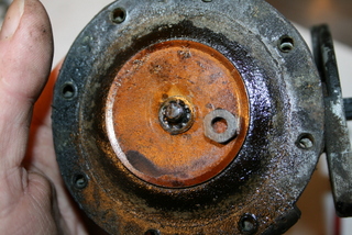 . Présentation de la coupelle en laiton; j'ai laissé l'ancienne rondelle d'étanchéité qui est restée collée sur la plaque inférieure comportant la patte du levier manuel :