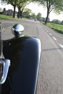 Nous sortons après Wavre, là cela devient plus amusant, et même très amusant, des petites routes pavées à travers les champs, parfaitement adaptées à cette vieille bagnole! Un couple de cyclistes nous croise, et propose très gentiment de nous prendre en photo ! André a mis ma casquette "Treignac" et ses lunettes d'aviateur