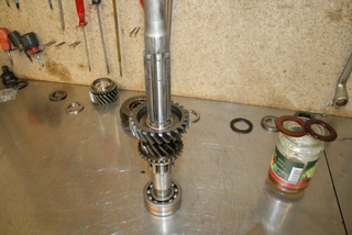 on dépose le pignon fou de 1ère et MA (je rappelle que sur cette boîte de 38 la bague de ce pignon n'est pas flottante, mais constituée de 2 bagues identiquesà celles du pignon de 2è sur l'arbre primaire. N'ayant aucun jeu, elles n'ont pas été changées) et on enfile l'arbre avec la rondelle Céloron de réglage par l'arrière