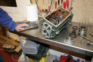 J'ai mis Martin à contribution aujourd'hui pour terminer la boîte, j'ai en effet enfin trouvé de l'Hermetic. Mais il me faut de l'aide pour serrer les écrous des arbres à 150 Nm ... Il est presque 10h, on s'y met, Martin, concentré à l'extrème,enfile ses gants. J'admire, mais comme je suis incapable de travailler avec des gants, je garderai des traces d'Hermetic pendant quelques jours ... . Redémontage des chapeaux :