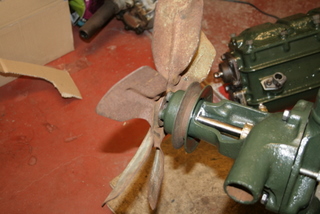 Une hélice de ventilateur 6 pales en refabrication est très bon marché, mais je préfère sauver celle de 38, malgré son aspect peu engageant. Donc, comme d'habitude, traitement chimique. Je fais cela à l'extérieur, car les vapeurs d'acide oxydent instantanément toute pièce d'acier non peinte ! Pas question de faire cela dans le garage ... Sur le trottoir devant la maison !