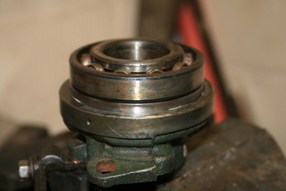 En attendant, je me suis décidé, faute de mieux, à acheter un roulement SKF 7207B (35x72x17) à contact oblique pour la butée d'embrayage . Il est légèrement différent du roulement d'origine introuvable (un 35x72x14, 14 mm étant l'épaisseur de la bague extérieure), mais convient moyennant une petite modification du capot. De gauche à droite au fond, une butée complète assemblée, une butée avec un 7207 "exotique" que je préfère ne pas utiliser (et le capot était absent), et le support de butée de mon moteur, avec devant son roulement d'origine HS, le plateau de friction et le capot à modifier, et enfin le roulement neuf : . Je commence par graisser l'arrière du roulement (il est à contact oblique et a donc un sens, l'appui des billes vers la boîte !) :